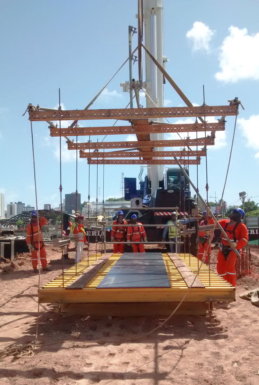 One particularity of this construction job is that it did not require any openings for machinery to pass. For that reason, the option was made in favor of isolated towers, resulting in lower cost as compared to other metallic structures normally used. BRIO scaffolding was used for falseworks and scaffolding in the first concreting and the T-60 Falsework was used when a greater load was required.