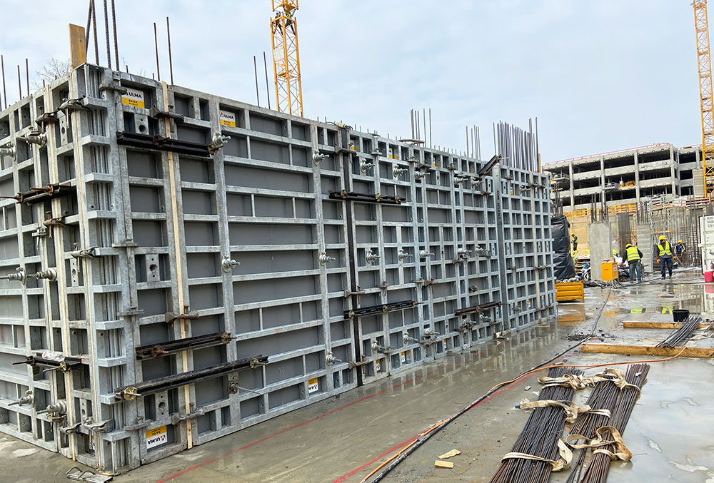 Another requirement of the project was to build the enclosure walls over two storeys in one go, and the wall formwork required for this only has to be able to be operated from one side. For this reason, BATEK modular formwork was used.