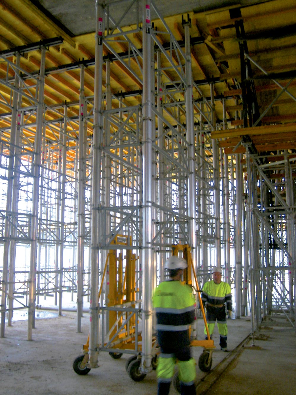 Its assembly was done with shoring tower modules that were transferred with auxiliary equipment. The mechanical transfer of the shoring towers was carried out using telescopic handlers. In this manner, the 16 m of tower were handled with the telescopic mechanism and the crane.