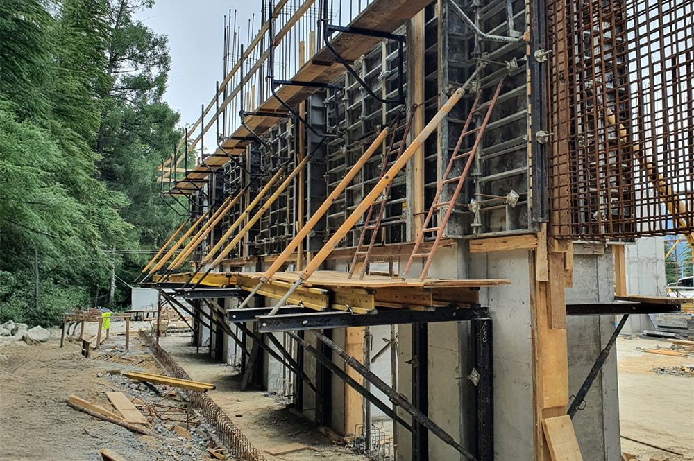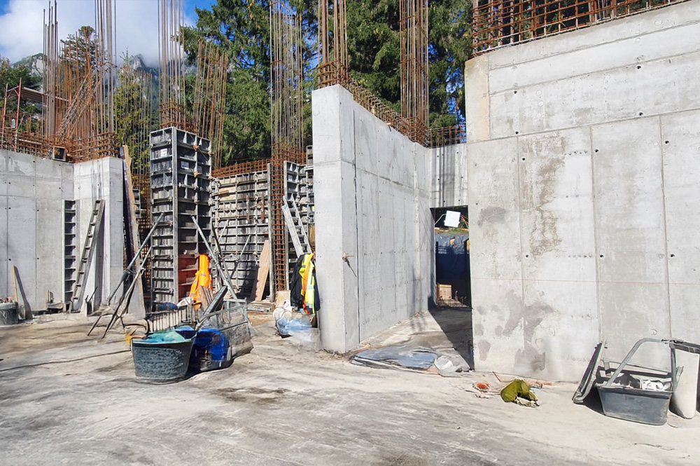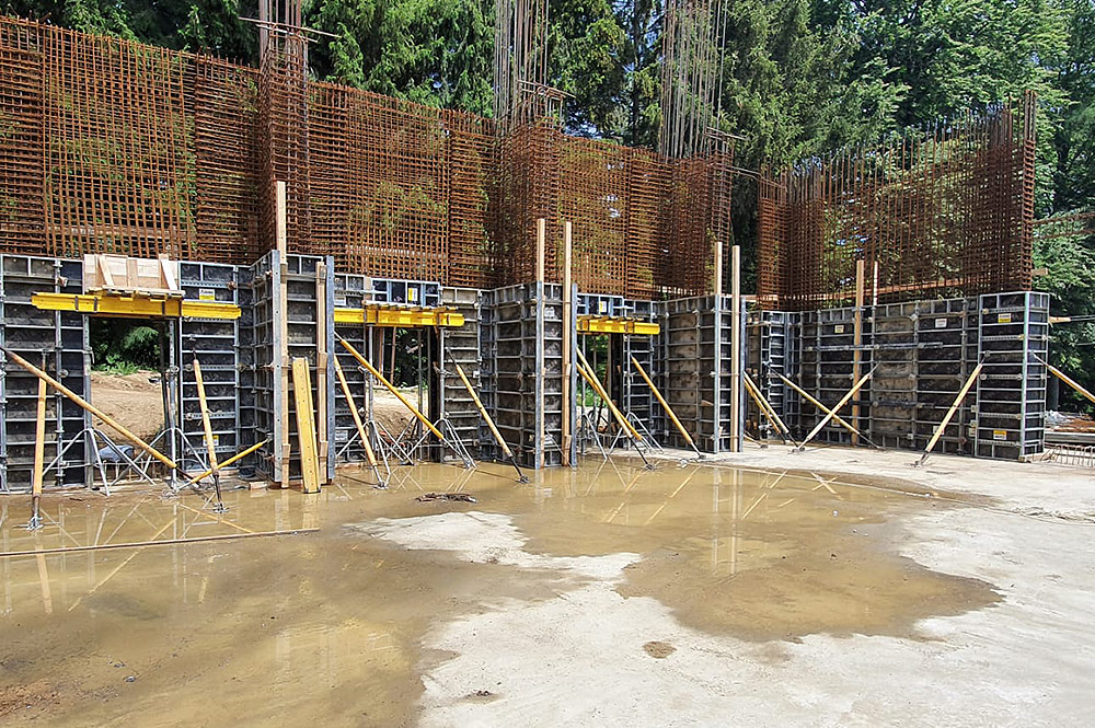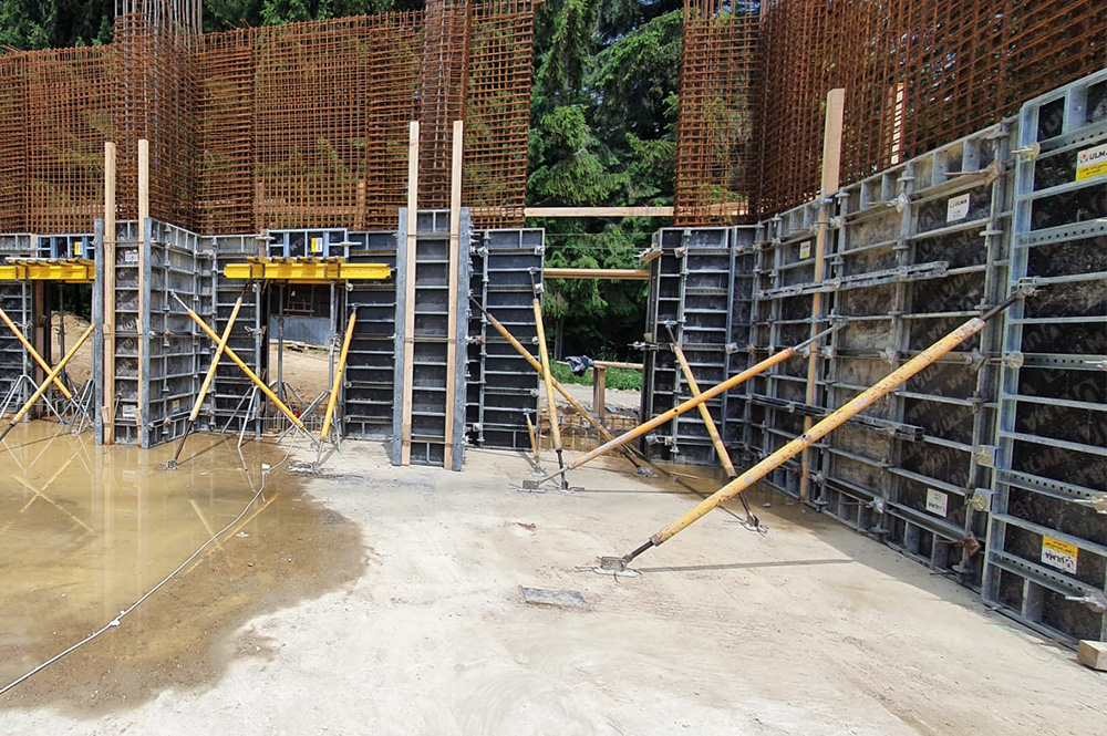 Building consisting of a high ground floor and 5 standard height floors. To support the 6m high ground floor slab, the Rapid system was used together with G shoring system. The LGW system was used for the walls, and the circular pillars were made with the CLR system.