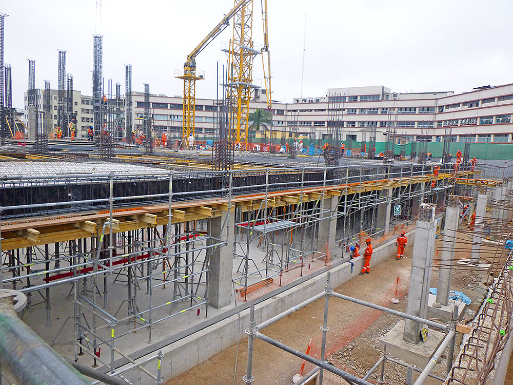 In the area where the container wharfs were, the height to be shored was extremely diminished, calling for the versatility of T-60 Towers. This system features a wide range of frames with high load-bearing capacity and adjustable height, making for a quick, safe, and effective solution for the distinct height requirements presented by the building.