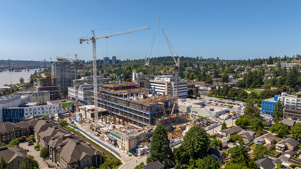 The redevelopment of the oldest hospital in New Westminster, Vancouver, will expand its services with new facilities: a 10-storey intensive care building, expansion of the emergency and maternity ward, new operating theatres, among others.
