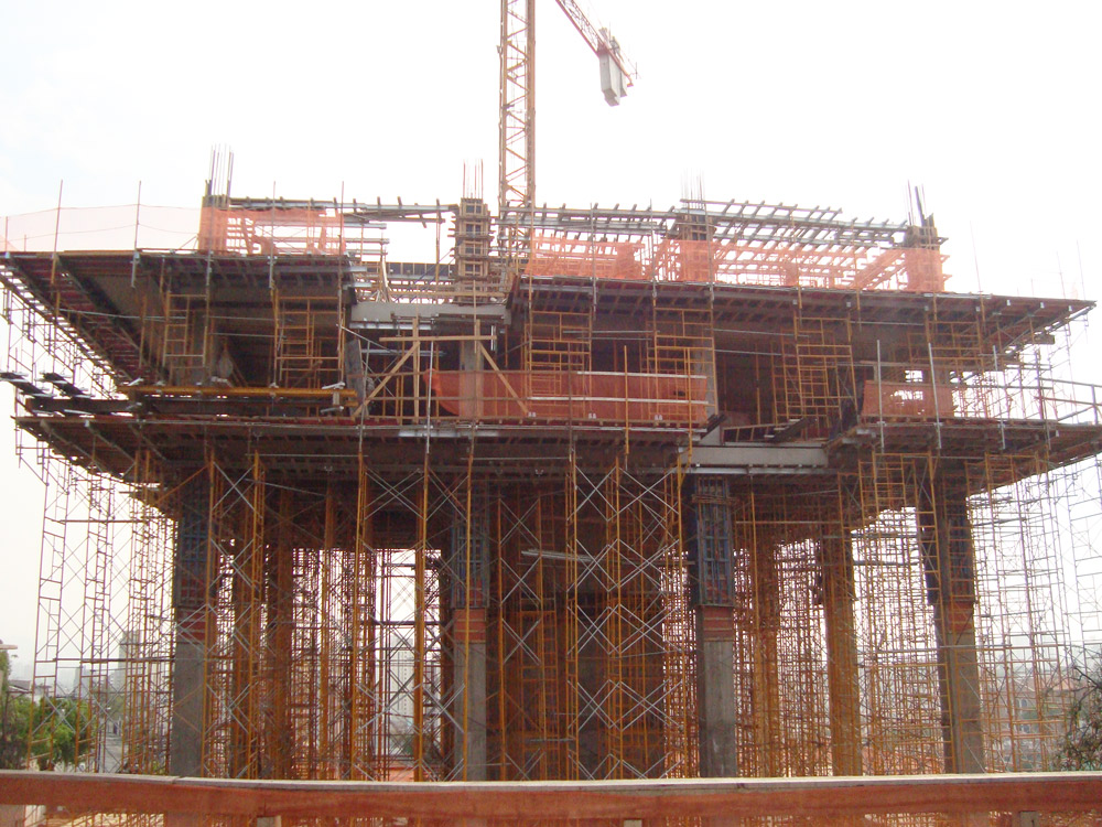 For lower heights, the horizontal structures were shored with SP Props. For the perimeter and heights exceeding prop length, G Shoring was used. The changing building geometry demanded reinforcing cantilevers with steel beams and profiles in varying positions on each floor.
