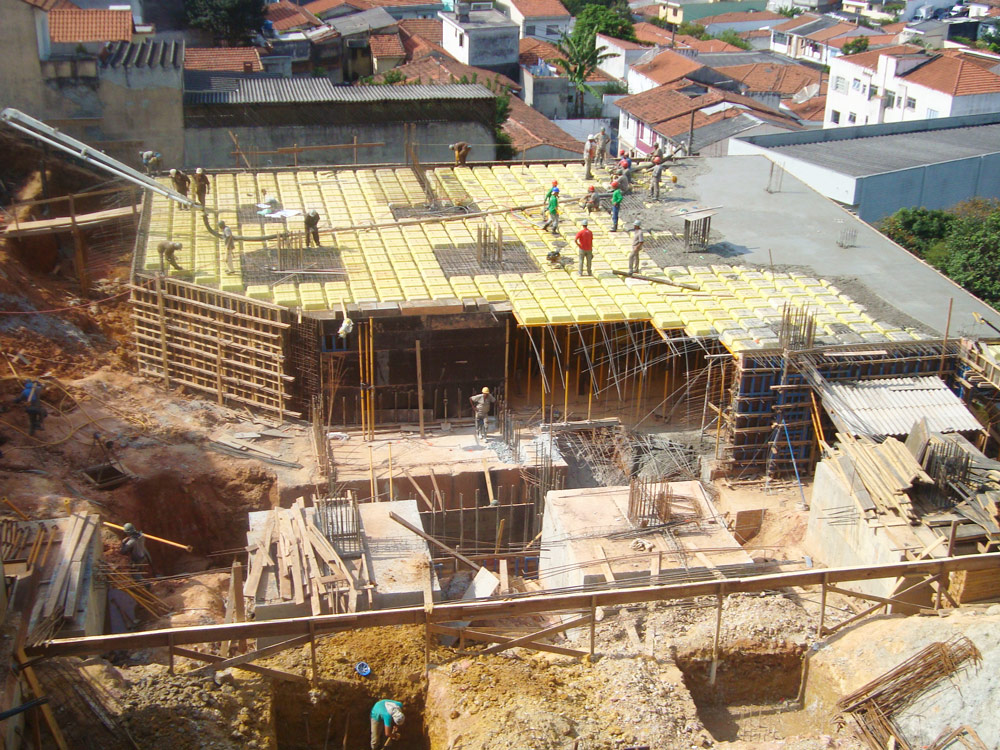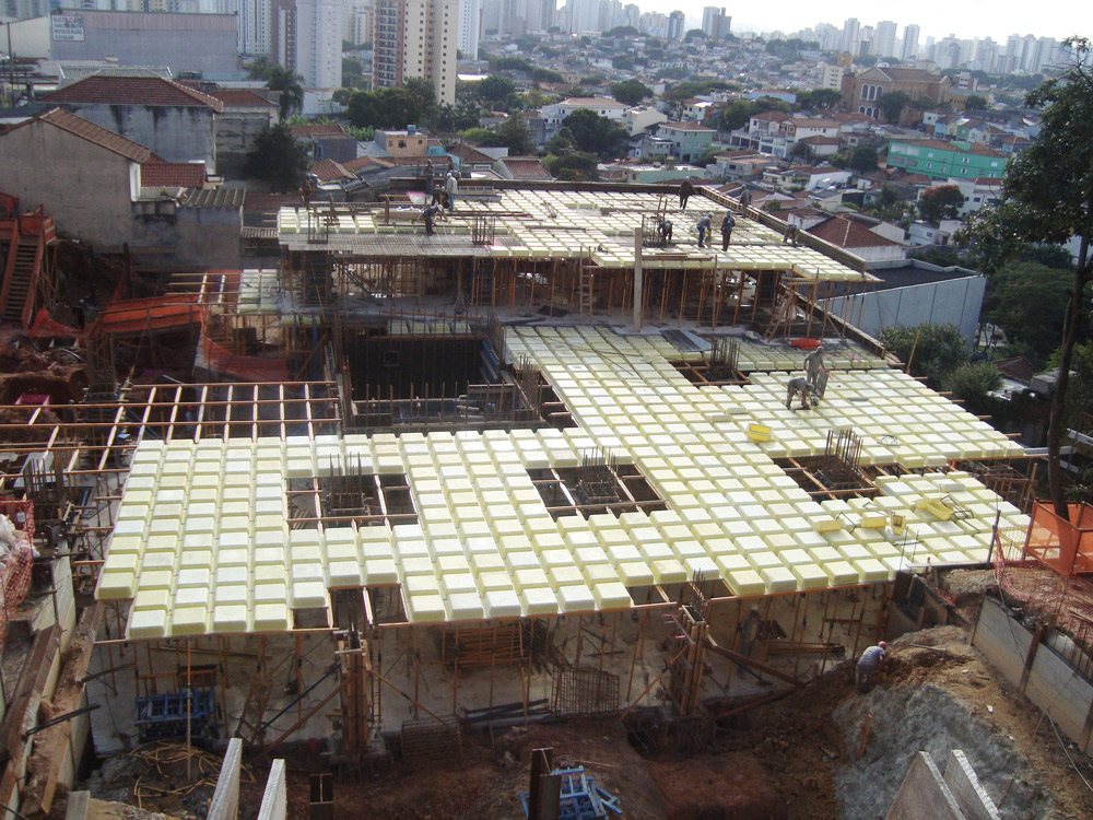The slabs of the four basements (more than 6,000 m2) were quickly and safely built with the recoverable system for reticular slabs RECUB with 20 cm waffle and 5 cm compression layer. For conventional slabs, BTM formwork was used with weekly pouring cycles.