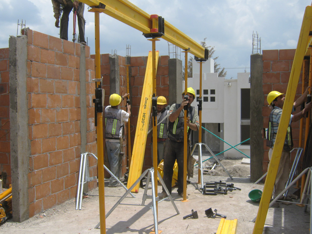 The homes, with lightened slabs, were formed with ENKOFLEX. Since this is a formwork made up of independent beams, the system offers high versatility and may be adapted to irregular slabs. ENKOFLEX was supported on SP Props through double heads VR. Various structures, like the parapets, were cast with COMAIN system. This formwork is adequate for any type of construction work in which no crane is available and a good finish is required.