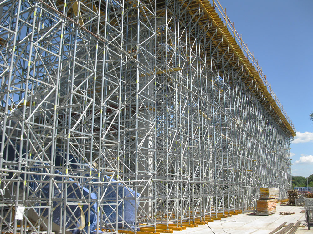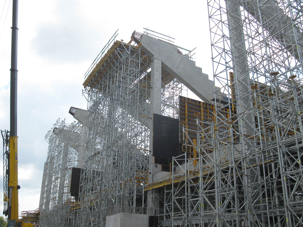 MK shoring towers were able to support the loads of the 19 lattice beams, nearly 40.3 m long and 540 kN each, and 4 corner beams, 57 m long and 770 kN each. With a width of 2.2 x 2.2 m and a height between 19.2 m and 26.5 m, the towers were placed on the stand's stairs or on the ground floor, depending on the execution phase.