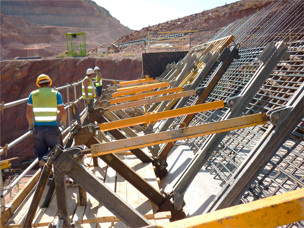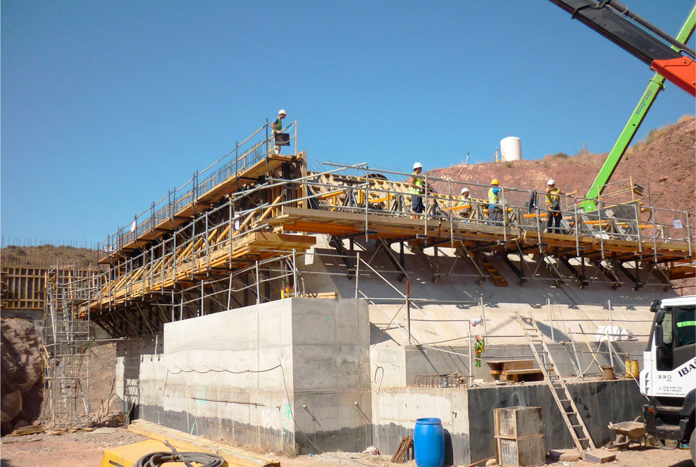 The 55 m wide valve chamber was built mainly with ORMA modular formwork on Climbing Brackets 2000 and UCAB-EUC trusses. For the less thick slabs, RAPID slab formwork and ENKOFLEX beam formwork was used. The thick slabs (above 70 cm) were built with ENKOFORM H-120 slab formwork.