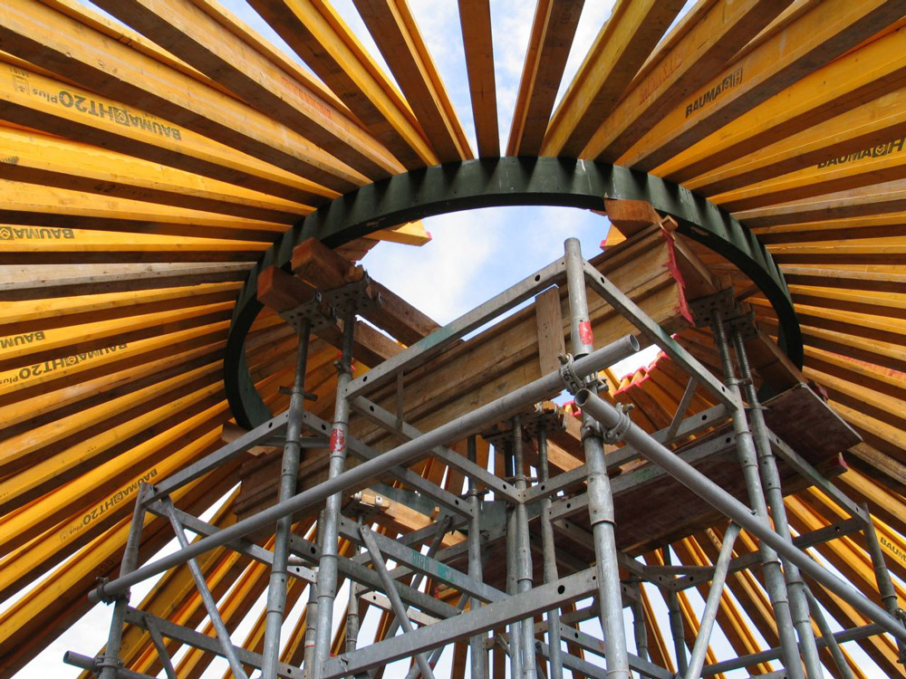 - The execution of 8 embedded columns for anchoring the circular system of pre-stressed cables. To do so, the design and construction proposed involved an integrated structure with elements of vertical modular formwork, H-120 beam system, and timber structures.