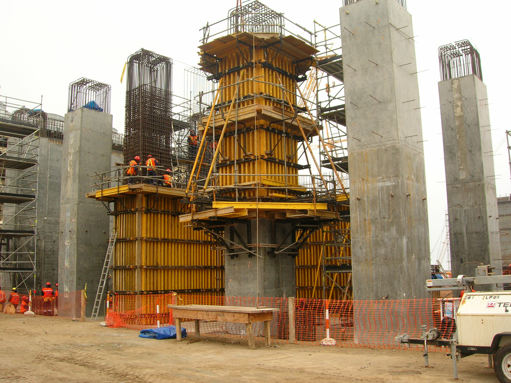 A platform located under each of the axes of the pier was executed with the BRIO system. Additionally, a cantilever scaffolding structure was erected, with a length of 35 m, to perform painting and welding tasks, etc. This scaffolding was rotated from the first axis to the last one. This project has been the first in Peru with such magnitude of cantilever scaffolding.