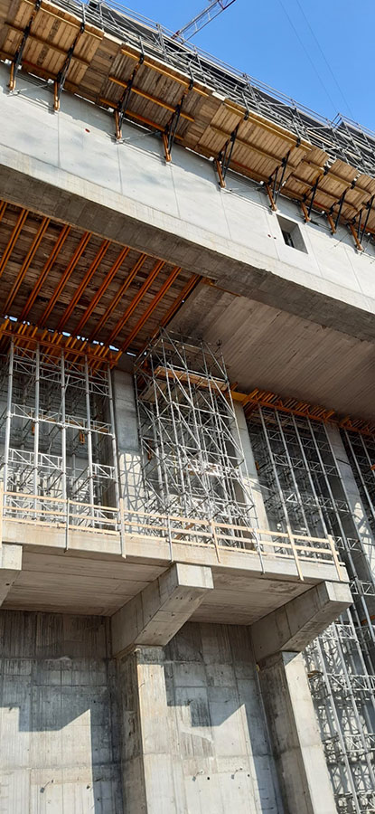 MK Shoring Towers were used to prop the 6 m thick transverse beam, built at a height of 21 m, to support the hopper that feeds the plant’s large turbines. The considerable thickness and weight of the beam required the use of heavy-duty MK towers, whose size and flexibility of configuration make them extremely efficient.