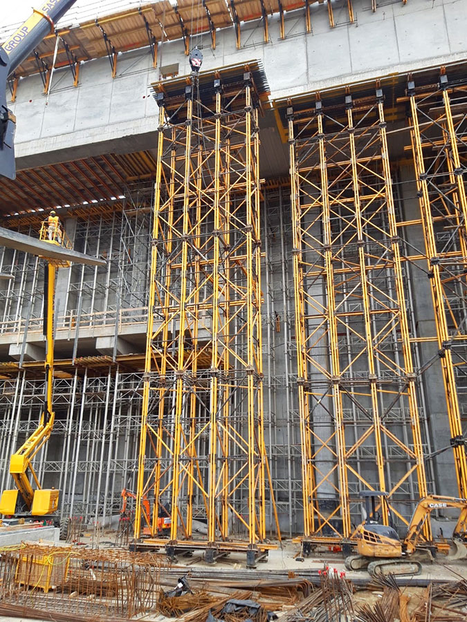 The walls, which will reach a total height of 40 m, along with the buttresses, were built with ORMA Panel Formwork set on BMK Climbing Brackets anchored to the previously poured concrete.