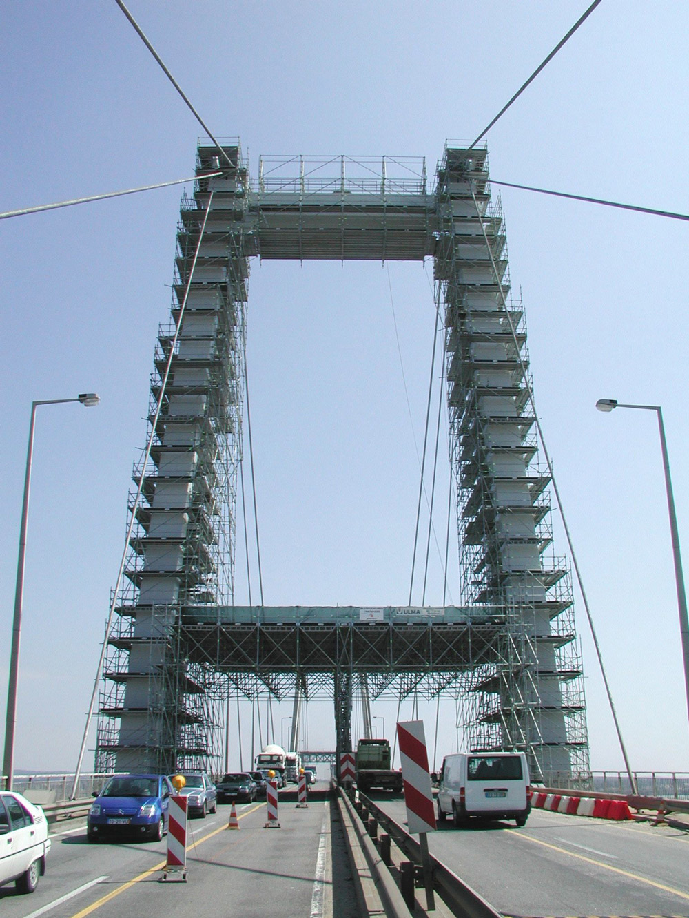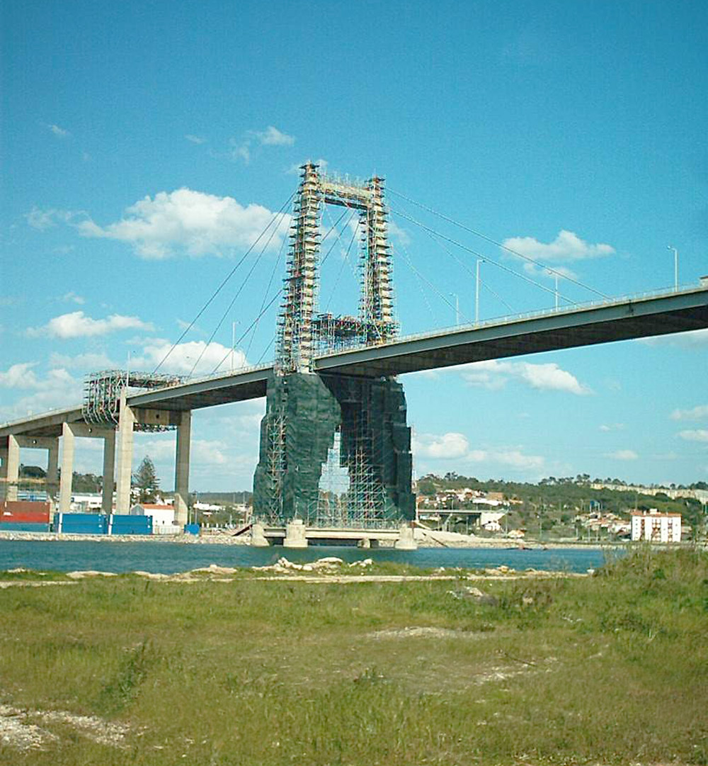 This was a restoration project of a bridge built over the Mondego River. Specifically, the pier was restored to an "A" shape. The job was confronted with considerable dimensions at a height of 80 m.