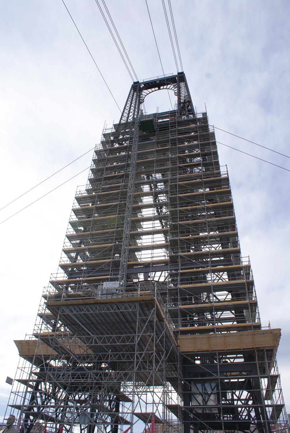 The structure was completely clad with BRIO Modular Scaffolding. 800 tonnes of material distributed over 4 towers of 68 m and the horizontal steel frame of 162 m length. The scaffolding for the towers was supported on the ground, while the one for the horizontal structure hung from a truss.