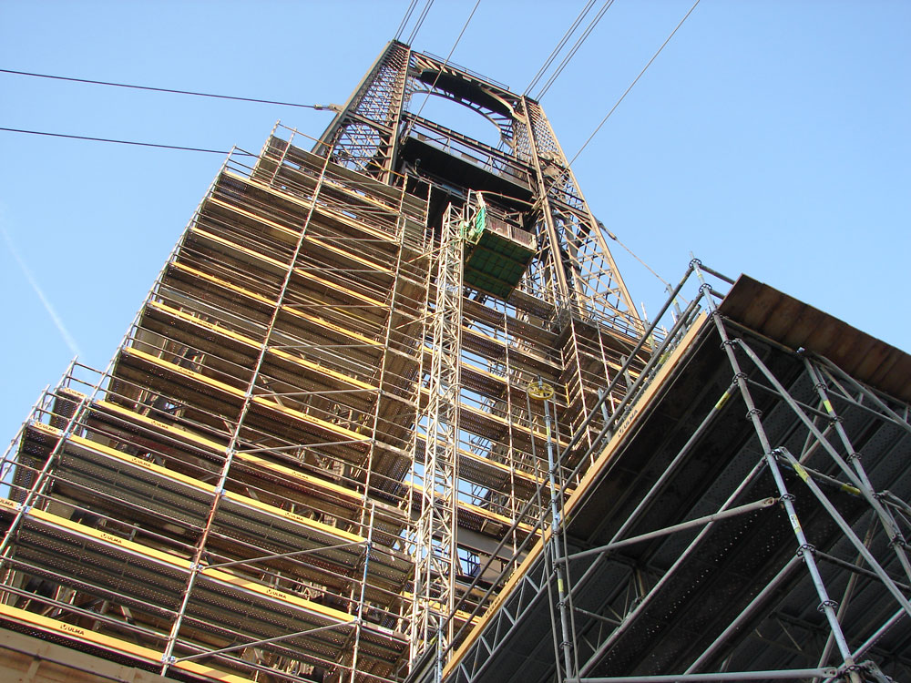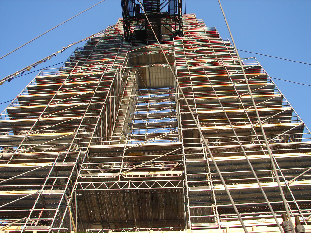 The scaffolding structure of the towers was also used for the fitting of the builder's hoist support platform. This platform was made with scaffolding platforms resting on 5 m long bridging beams at a height of 7.5 m.