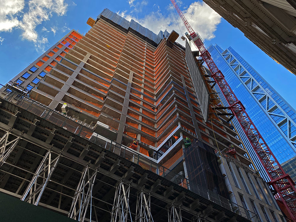 The 24.200 m2, 124 meters tall, 31-story mixed-use superstructure just topped out last week in Lower Manhattan. 185 Broadway was designed by FX Collaborative Architects and developed by SL Green. It is expected to have over 200 rental units, including studios, 1, 2, and 3-bedroom apartments. The structure will also include retail spaces and three floors of commercial space.
