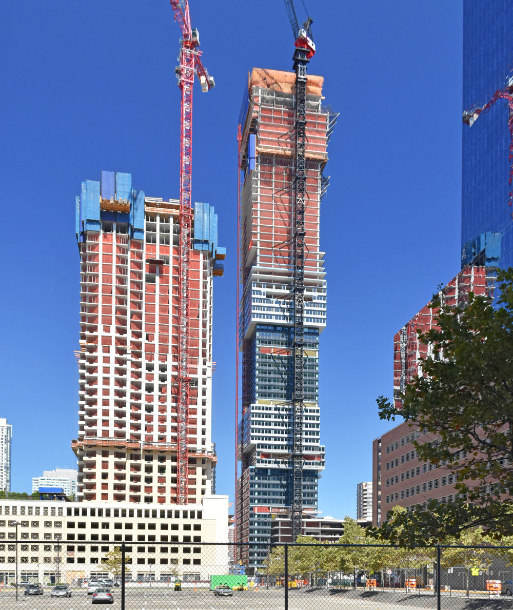 A series of buildings are being constructed along the banks of the Hudson River with spectacular views of Manhattan. The Harborside Tower was designed with 69 stories, 763 residences, and a total height of 702 feet. It is now the tallest residential building in New Jersey.