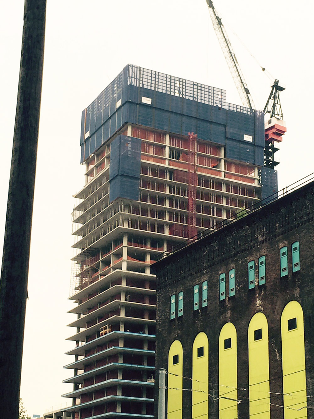 The tower perimeter was protected with HWS Screens, a safety system composed of straight lightweight panels used without working platforms. Movement on the worksite was thus streamlined and both workers and equipment were protected from falls.