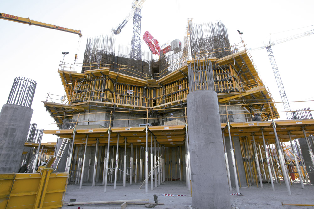The 6 underground floors and the first 6 floors above ground level were completed with CC-4 aluminum horizontal formwork, along with the ALUPROP Prop, with which high construction performance was obtained. One of the most important advantages that the CC-4 provides, compared to other products on the market, is the possibility of first assembling the grid and then placing the panels.