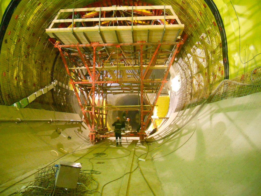 Tunnel SO 04: two consecutive tunnels with different sections and vault lengths, in addition to the bottom and side walls, had to be built.  This was all done with formwork carriers with structures pre-assembled in warehouse, which eased the erection and saved valuable working time.