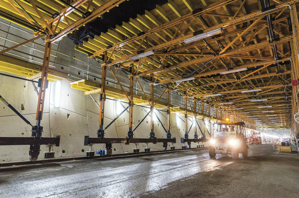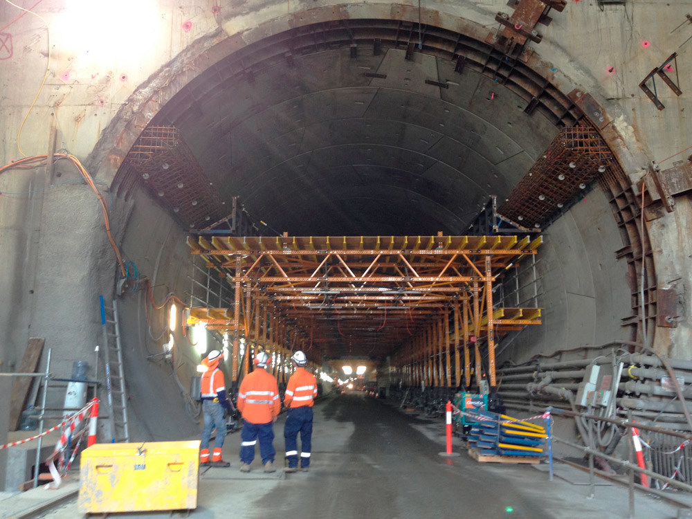 For the first time in a tunnel in Australia, the pre-stressed slabs of prefabricated concrete only rested on an in-situ poured cantilever. This work posed a great challenge in terms of logistics, geometry, space and safety. Moreover, the cantilever had only minimum tolerances to accomplish the airtight seal of the ducts.