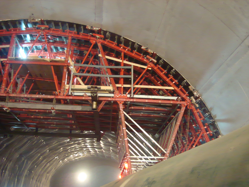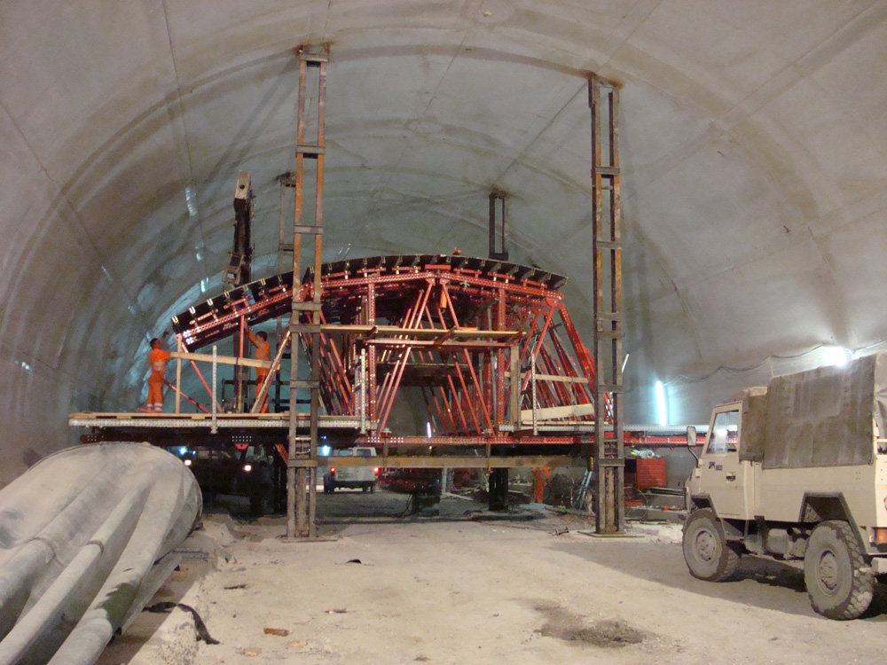 The formwork carrying trolley used to build the tunnel galleries (15.7 m wide, 6.2 m long and 9 m high) was made up of standard parts. Hydraulic jacks controlled from a central unit were in charge of putting the formwork panels in place and moving the structures inside the tunnel. This system made the task of moving the 28 t MK Structure easy. The vault formwork carried by the trolley was lifted by means of hydraulic cylinders.
