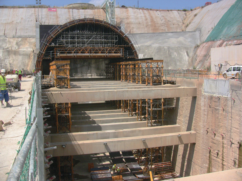 The 14 m long form carrier with a vault diameter of 22 m was used to build a 130 m tunnel in successive pouring stages of 12.35 m.