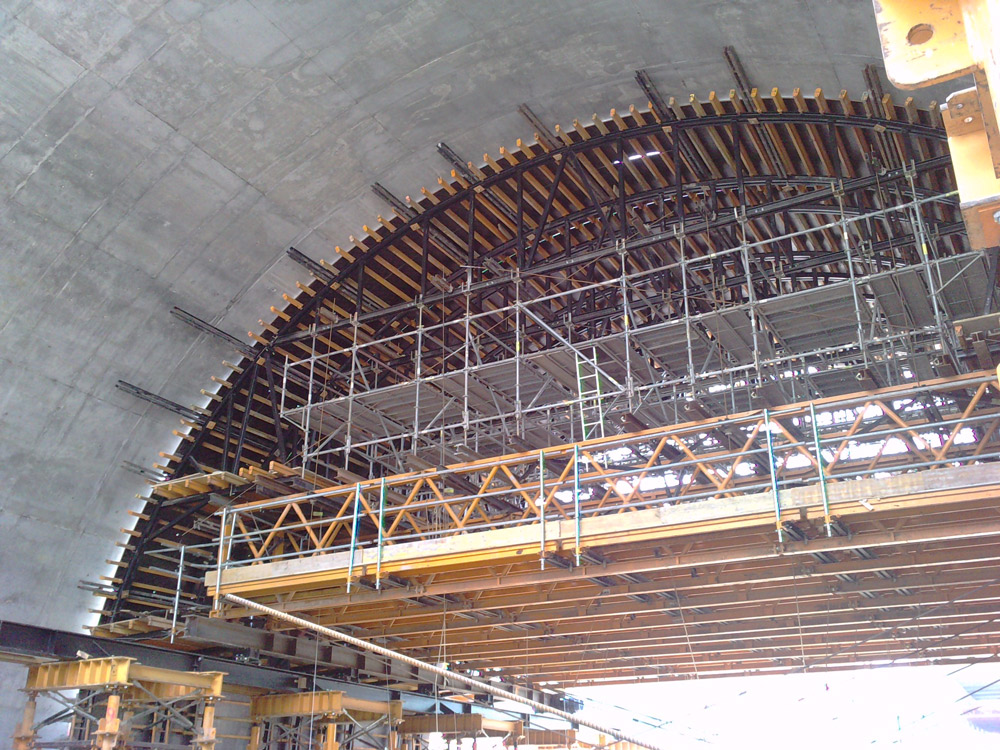 The works were carried out at a height of 17 metres because on the level below runs the underground and intermediate slabs are reduced in thickness. As a full shoring structure could not be implemented, a technically highly complex solution with vertical formwork carrier at height, shored by Towers T-500, Structures H-33, Towers BRIO and curved walers, which also provided cross reinforcement of the concrete at every 5.2 m, was developed.