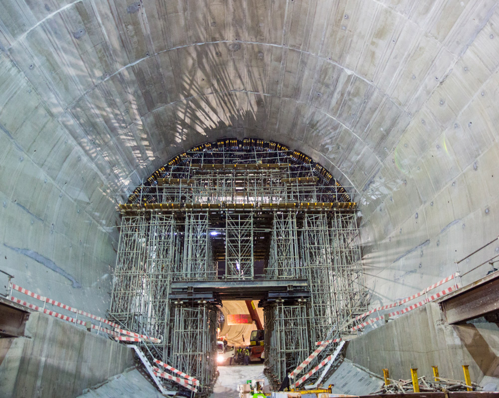 For this project, with more than 9 km of subterranean galleries, standardised systems were employed to adapt to the different geometries and the completion times agreed upon with the client. Tunnels with diameters varying between 8 m, 16 m, and 20 m were built using simple assemblies.