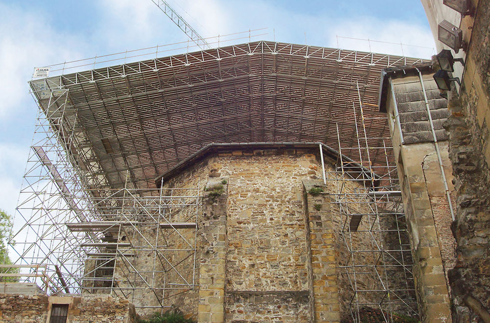 A scaffolding structure that covers the entire perimeter of the building under construction. It is an ideal solution when site safety requirements are demanding. As well as guaranteeing worker safety, it facilitates various tasks such as the placement of stop-end formwork and rebar, pouring concrete, even installing scaffolding and exterior finishing. The protection scaffolding is built up along with the structure being constructed.