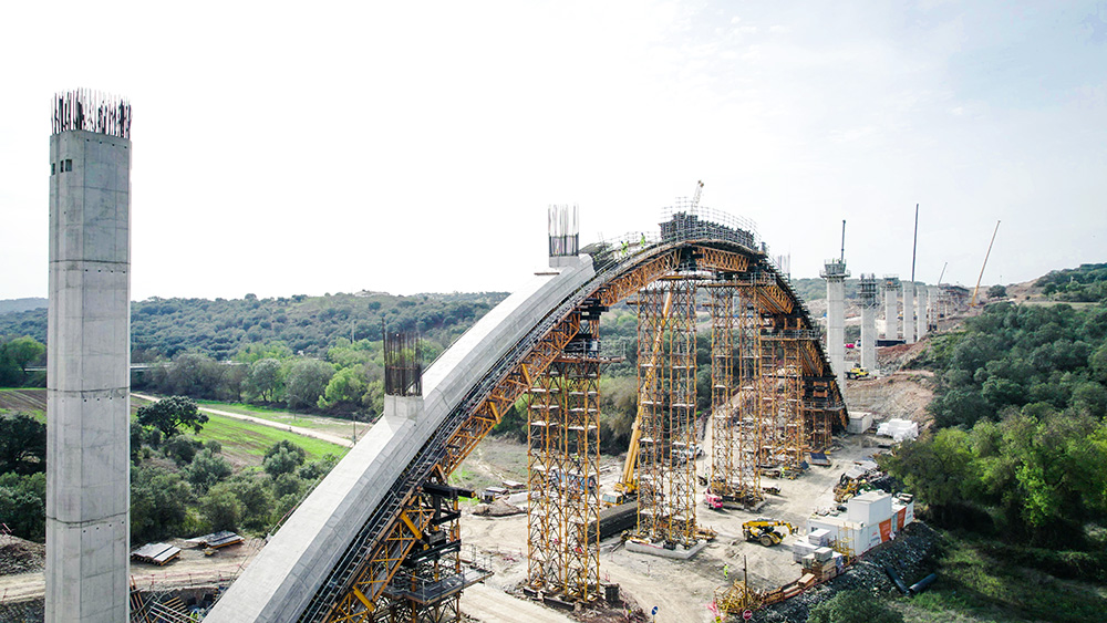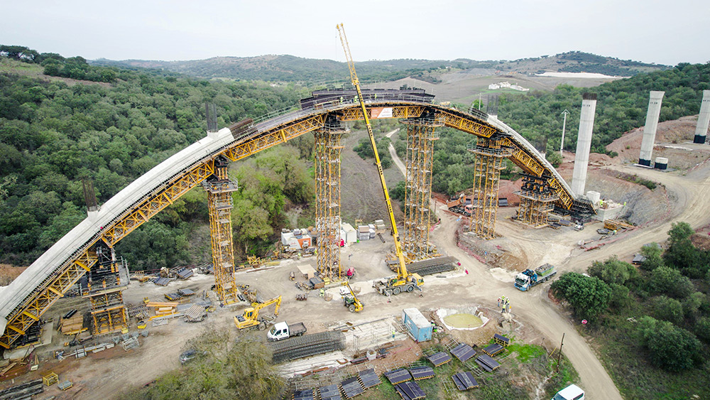 “The most complex part of the construction of this viaduct is undoubtedly the arch. Due to its construction process, we adapted the T-500 tower system, a heavy-duty system with H-33 trusses that allow large spans to be bridged. We positioned these towers in the ideal places to place hydraulic jacks that would allow us to correct the heights of the two half-arches. Finally, we created a central beam where the arch is tensioned and compressed in order to be able to brace it without the problem of introducing unforeseen loads.”, comments Nuno Filipe, Site Manager, Construgomes Engenharia.