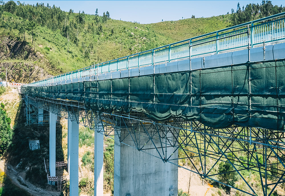 ULMA’s solution consisted of a continuous working platform, built with the BRIO Multidirectional Scaffolding system in a cantilevered and suspended configuration from the deck of the bridge. This 12-metre-wide platform was deployed across 19 spans of approximately 20 metres each, providing full access to all intervention areas without interrupting circulation. Additionally, ULMA designed and supplied bespoke formwork solutions for the execution of edge beams and concrete structures associated with the bridge reinforcement.