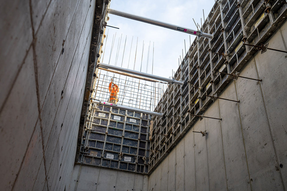 For the construction of cores, shear walls and columns, the MEGALITE modular formwork system — supplied in imperial measurements — was used for heights of up to 4.8 metres. This system offers a lightweight, robust and easy-to-handle solution, ideal for projects with tight schedules and high technical demands. It also ensures high-quality concrete finishes and enables a fast and efficient work cycle.