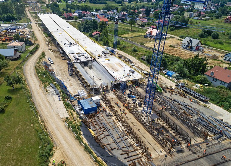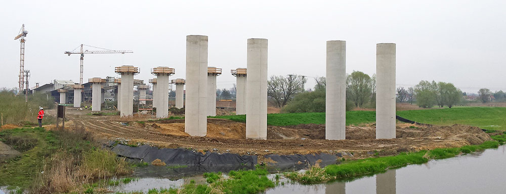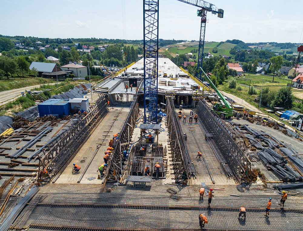 On the route of the S19 between the Świlcza junction (DK4) and Rzeszów Południe junction (Kielanówka) – a 476 m long E-1 Bridge is constructed using the incremental launching method. This structure with the straight-shape layout in a horizontal projection has a longitudinal gradient of 0.8%. The superstructure of the viaduct was designed as over 11 m wide and 3.5 m tall box-sections. The construction was divided into 17 stages of various lengths. One stage will be about 14 m long, three stages 24 m each and the remaining ones 30 m each. In case of this structure the system of hydraulic cylinders was used, which pull the superstructure on the constructed piers in 30-centimeter strokes.