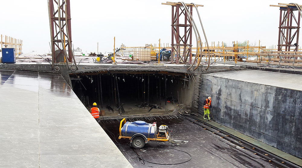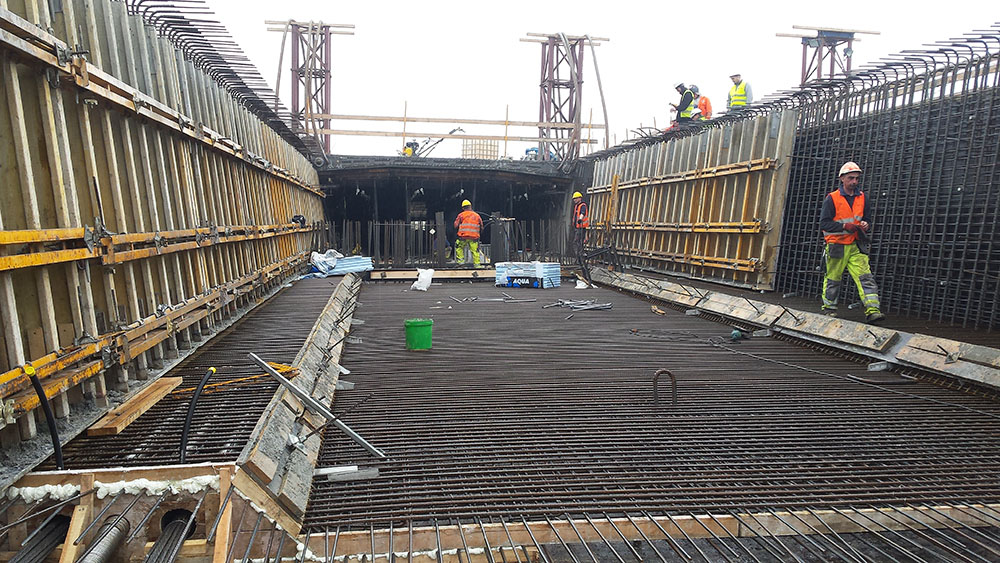 This system enables an easy and safe detachment (lowering) of the entire external formwork structure over the length of about 30 m (an equivalent of 700 sq. m. of formwork) and re-establishing it on the concreting position. After each pour, with a hydraulic system the outer formwork was detached and prepared for the following cycle while the inner formwork units were rolled back for the next pouring. Applying the hydraulic system significantly facilitates and speeds up the assembling work and helps to improve the economics of the project.