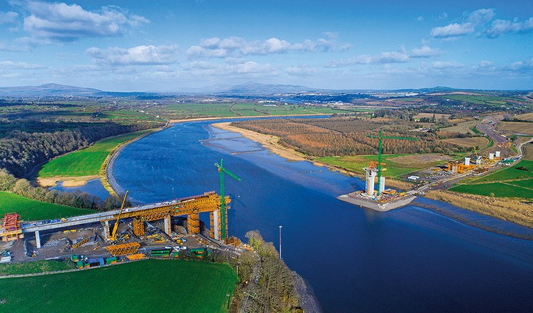 The bridge over the Barrow River, is an extradosed structure 887 m in length, making it the longest bridge of its kind in the world. This type of bridge is characterised by its cables set at lower angles, meaning that pylons are shorter in relation to deck span lengths.