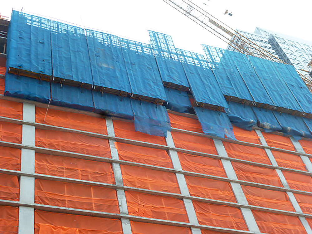 In order to ensure a safe working area, the building perimeter was covered with self-climbing HWS protection. The system is made of panels that envelop the storey under construction and three storeys below, equipped with a hydraulic system used for raising the assembly as construction proceeds upward.