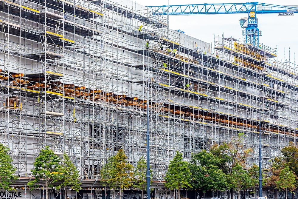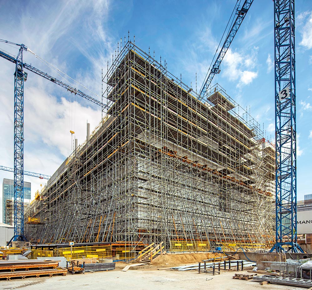 To support the upper façade, T‑60 towers were used inside the building, on the concrete structure, and on the outside, which were integrated into the BRIO scaffolding. A metal beam grid and wedges was placed on top of the towers to allow the façade to be lowered. The beam grid was inverted by 90 degrees with respect to the framework of the lower façade, so that the forces caused by the weight of the upper façade would be displaced outwards from the lower façade, which had already been built.