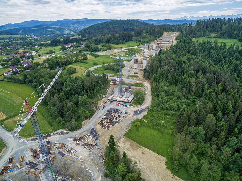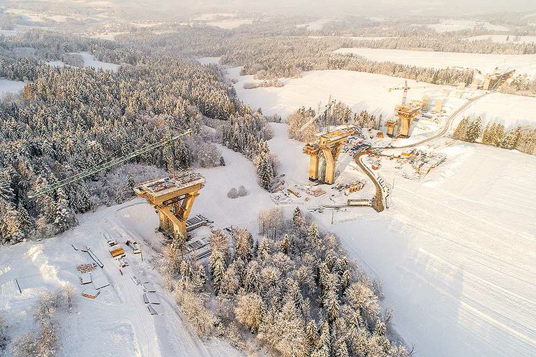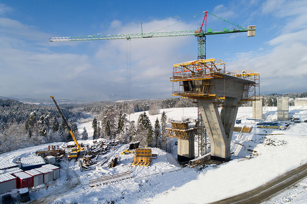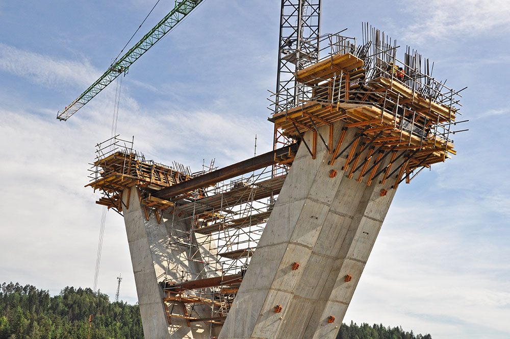 The Y-shaped piers were built in three distinct phases. The hollow rectangular bodies were built in 4.56 m pours with the VMK timber formwork system set on configurable BMK climbing brackets. At the base of the column head, where the arms of the Y begin, single-sided UCAB-EUC formwork was used with the BMK brackets. This combination made it possible to create a support structure on which the 6.40 m wall formwork panels could be set. The last section of the inclined structures was completed with the ATR self-climbing system and BMK brackets, together capable of matching exactly the predetermined angle of inclination. The self-climbing system was formed with MK trusses and a unique configuration of cylinders placed on the exterior face of the column arms.