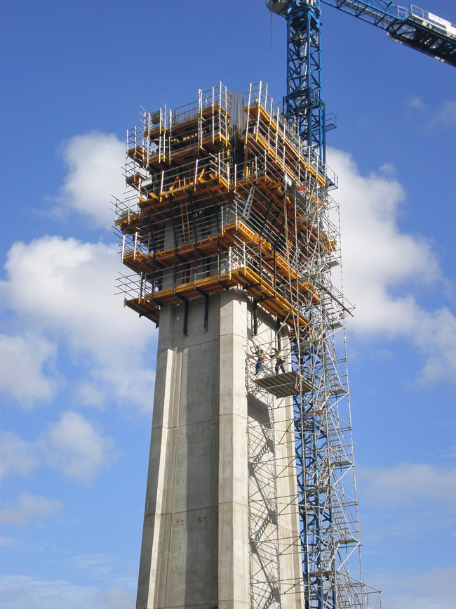 Configuración de consola del sistema de encofrado autotrepante donde el retranqueo (70 cm) se realiza mediante carros situados sobre la propia consola. Consta también de elementos de regulación para aplomar y posicionar el encofrado, horizontal y verticalmente. Se generan dos plataformas, una principal de trabajo (anchura 2,5 m) y otra para accionamiento del sistema hidráulico, además de otras 3 posibles plataformas para hormigonado, recuperación de elementos y otras tareas.
