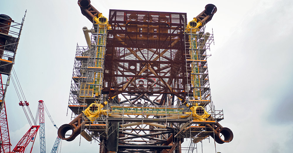 La parte inferior de la plataforma, que se colocará en el lecho marino, tiene 42 metros de altura y 13 metros de largo. En el interior y en cada uno de los lados de la estructura se han montado 10 torres de andamio BRIO de 14 metros de altura unidas por pasarelas de diferentes longitudes: de 6, 9 y 11 metros.