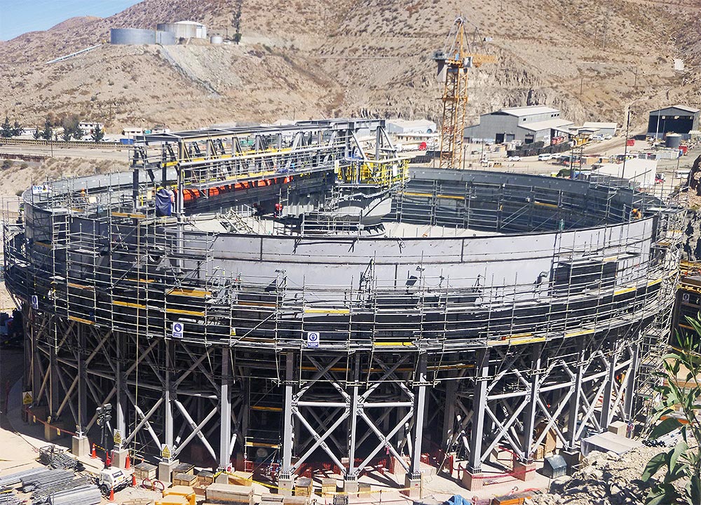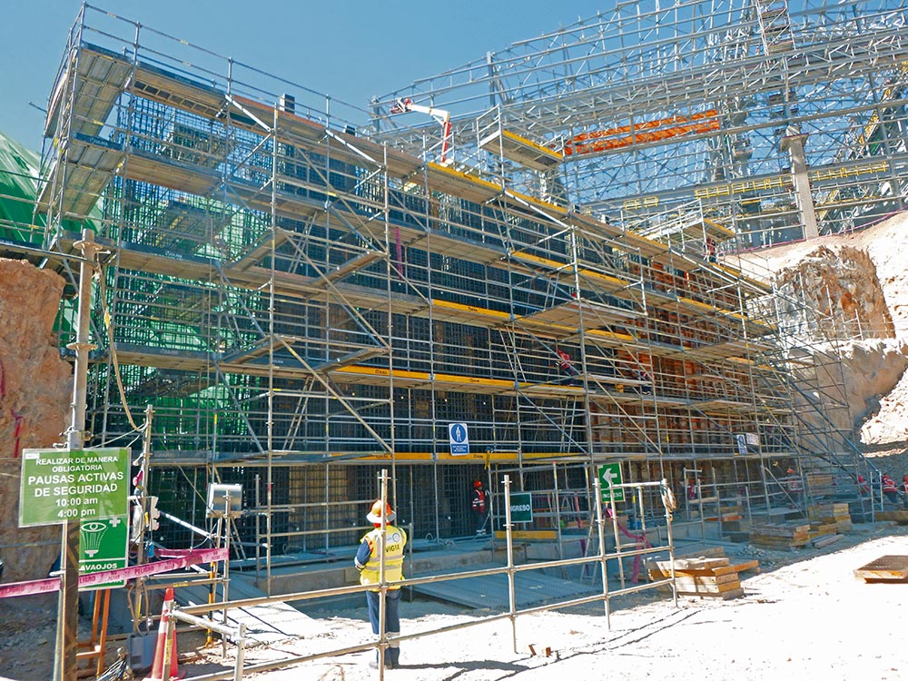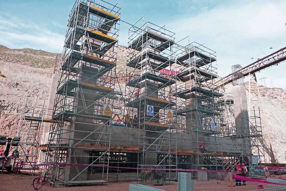 El encofrado modular ligero NEVI se ha empleado en los muros contrafuegos de 12 metros de alto y en las zapatas de los espesadores. Asimismo, en las columnas y placas de los molinos de rodillos de alta presión (HPGR) y silos. El sistema BRIO, en forma de cimbra, ha funcionado como apeo del encofrado de losa ENKOFLEX.