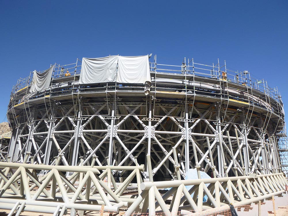 En la zona del espesador, se ha realizado el montaje de estructuras metálicas con andamios fijos, móviles y suspendidos. El andamio fijo es circular y bordea el perímetro en la zona interior con 2 m de altura y en el exterior con 6 m. Por su parte, el andamio móvil es circular y radial y se ha empleado en la zona interior con una altura máxima de 4 metros. En la zona interior se ha aplicado el andamio suspendido de forma radial de L= 14 metros.
