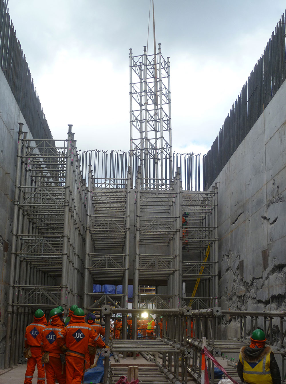 Para las estructuras verticales, muros de 1,5 m de espesor y de dimensiones constantes, se ha utilizado el encofrado ORMA, reduciendo al máximo el tiempo de puesta a puesta.