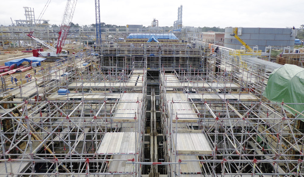 El sistema BRIO ha mostrado todas sus capacidades: flexibilidad al configurar cualquier geometría, estabilidad en cualquiera de los trabajos y rigidez en todas las estructuras. En las numerosas instalaciones de la planta, BRIO se ha empleado en multitud de aplicaciones, en forma de plataformas de trabajo, de cimbra, de escaleras de acceso… Y también como andamio suspendido, cuando no ha sido posible el apoyo sobre el terreno.