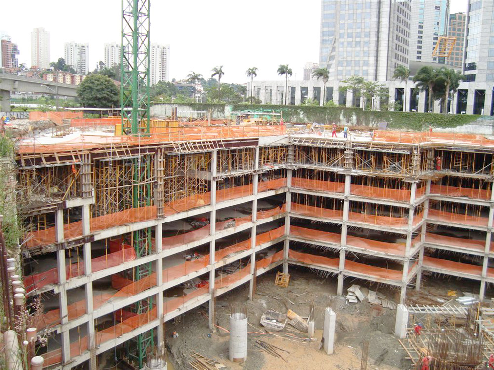 La periferia de la obra se divide en tres secciones de unos 2.000 m2, con 5 niveles de sótanos. La proyección del edificio tiene 2.400 m2, hasta totalizar 138.000 m2 de superficie construida.