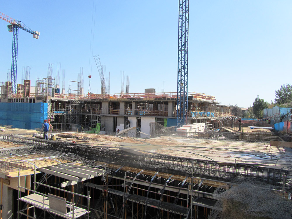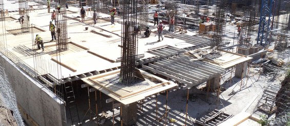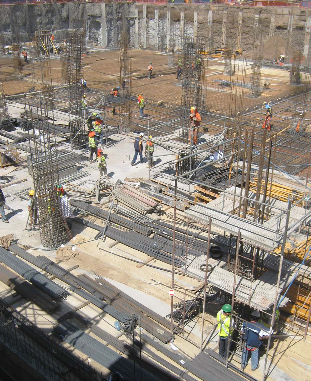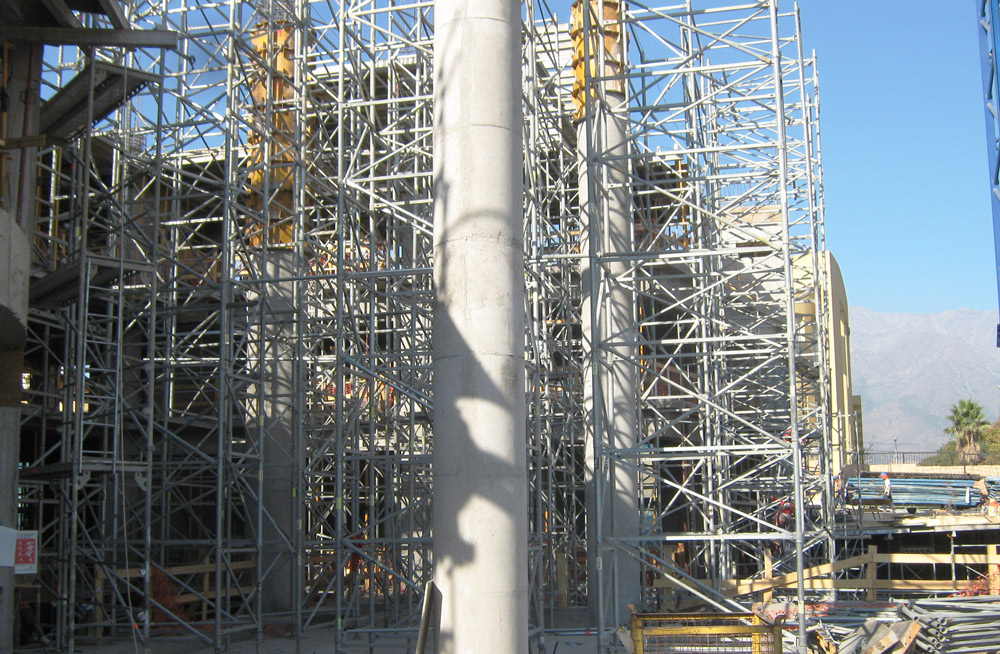 Las losas postensadas se instalaron mediante el sistema de vigas metálicas BTM apeado con Puntales SP. El apeo de la zona de acceso de gran altura se acometió con la Cimbra T-60. Con torres de fácil montaje y pocos elementos, estos sistemas fueron de gran aceptación en la obra, por la facilidad para superar desniveles en la cota inferior y por su gran rentabilidad.