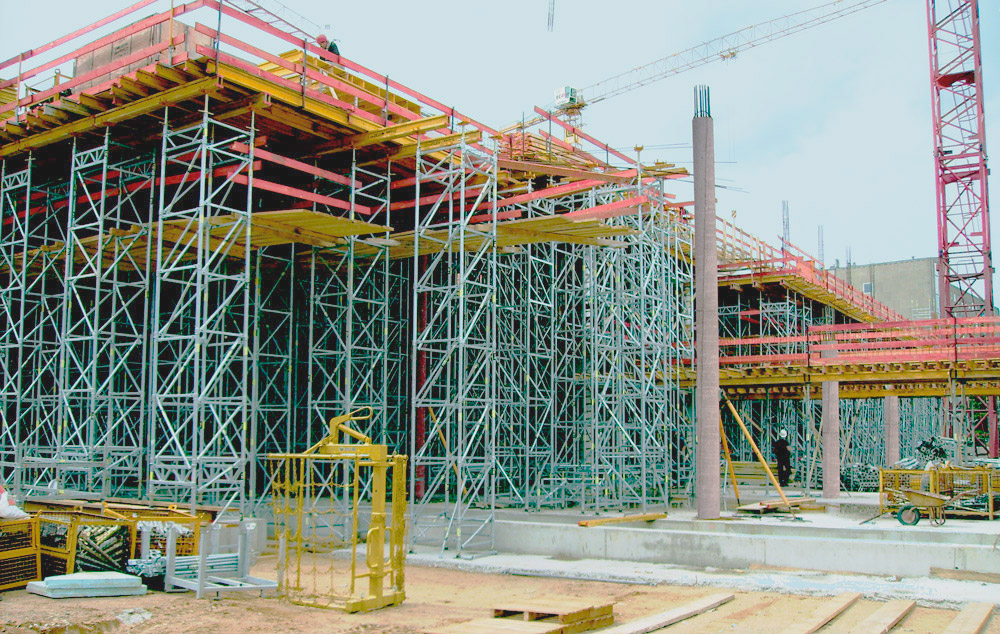 Los forjados se ejecutaron con 68.000 m de Vigas de madera VM 20 y con 11.600 unidades de Puntal EP. Los muros se realizaron con Encofrado Modular ORMA por cuyas características técnicas la obra se ha ejecutado a un ritmo eficaz. La amplia gama de alturas y anchuras proporcionó adaptaciones particulares a las exigencias de la obra. Estas cualidades permitieron un rápido avance, porque una vez montadas las unidades, y fijadas mediante grapas, se trasladaron en conjuntos de paneles con grúa.