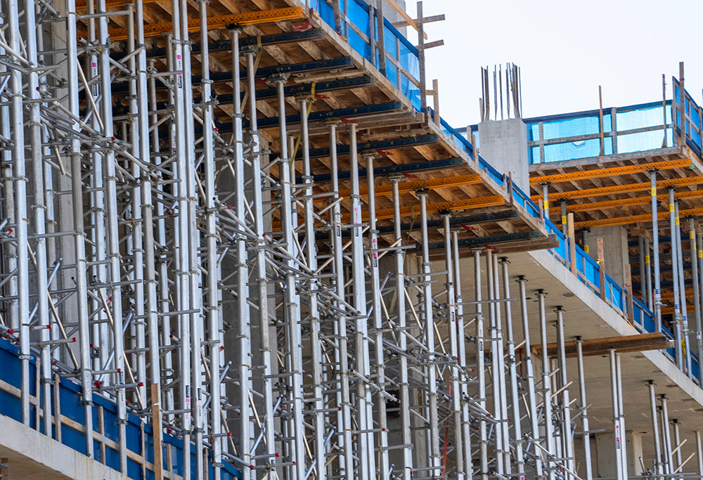Las Mesas VR-L con ALUPROP y riostras MK-120 han creado un sistema de apeo y encofrado para el hormigonado de forjados a 7 m de altura. Gracias a su menor peso, número de componentes, y a su mayor capacidad de carga en comparación con los sistemas de apuntalamiento tradicionales, ALUPROP ha facilitado en la obra el movimiento de los materiales de forma más eficiente con menos mano de obra y maquinaria.