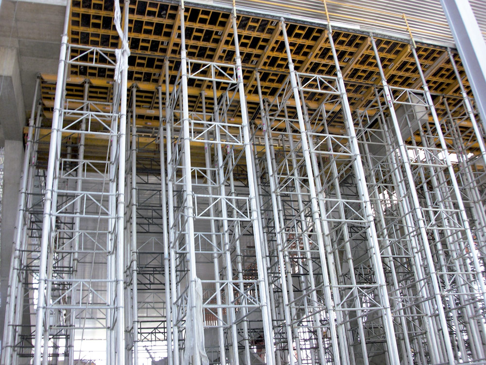 Para los 8 metros de altura que demandaba el diseño, se emplearon puntales de aluminio ALUPROP dispuestos en torres, es decir, amarrados entre sí. Los rendimientos de este producto, utilizado para la ejecución de las losas se incrementaron pues no fue preciso desmontar cada torre de 100 m3, sino que, después de cada uso, fue trasladada en su totalidad. De esta manera fue posible la reutilización de material, además de ahorrar en tiempos de trabajo ya que se evitó el continuo montaje y desmontaje.
