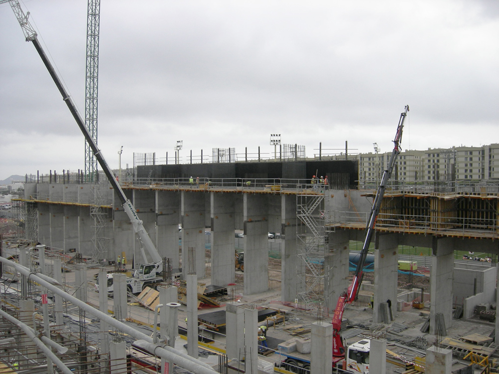 Sus dimensiones rectangulares son de 123,5 x 93 m, con una altura de 24 m y bajo cota 0 entre -5,4 y -12,36 m.